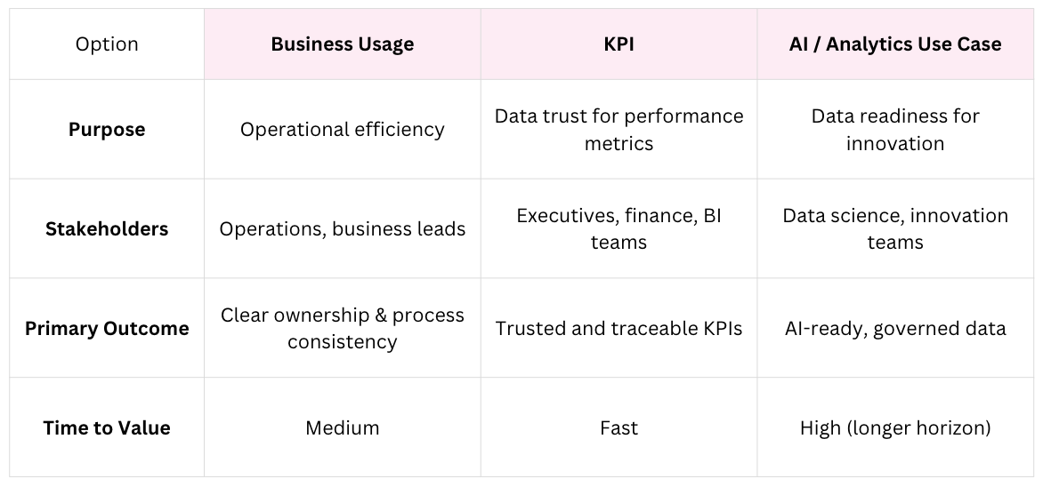 This approach connects governance directly to what executives care about most : trusted metrics and reliable insights.